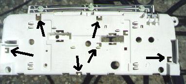 From the front, release one tab at a time, lifting the board slightly to rest it atop that tab, and continue around the periphery to the next tab, until all are tabs are free (the 6th tab in the middle, accessible from the back of the housing, is probably not actually retaining the board, but check to make sure). Remove the board.
